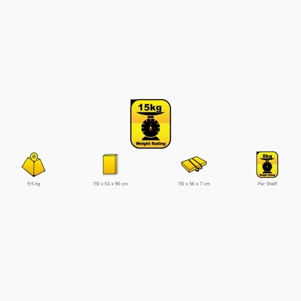 - Weight Rating: 15 kg Top weight rating. 8kg Shelf weight rating.
