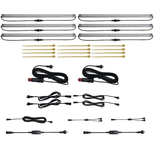 Includes: 6 x light bars, 2 x 5m 12V DC cigarette plug, 1 x 5m extension cable, 2 x dimmer switch, 2 x 1m extension power cable, 2 x 2m extension power cable, 2 x 2 way splitter power cable, 12 x re-usable flexi ties, 1 x storage bag