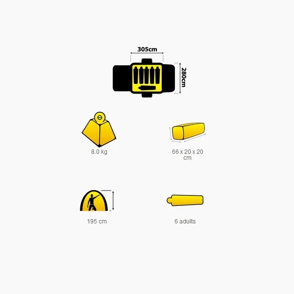 | Dimensions: | Tent head height: 195 cm Bedroom floor area: 305 x 280cm |